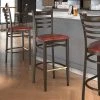 The Lancaster Table & Seating black top frame ladder back swivel bar height chair with cherry wood seat is perfect for any bar, restaurant, bistro, or coffee shop. It offers the ultimate in style with its ladder back and sleek black coloring. Plus, its bar height allows you to use it at both bar counters and raised tables for a more interesting dining room layout.