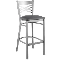 Seat your guests in comfort and style with this Lancaster Table & Seating clear coat cross back bar height chair with dark gray padded seat. This bar height chair has a sleek and sturdy metal frame along with a comfortable and soft 2 1/2″ thick padded seat. Its back rest features a trendy cross back design that adds a modern look to any location. Because it is contoured for a customer’s back, it provides unmatched comfort while maintaining a distinct appearance. The convenient foot rest offers additional comfort to help your patrons relax and enjoy your venue. This bar height chair is designed with integrated plastic glides to protect your floors from scuffing. The clear coat on the frame adds a contemporary touch and ensures longevity even through everyday wear and tear – resisting stains, scratches, and smudges. This reliable design ensures you’ll be using this bar height chair in your bar or restaurant for years to come! Overall Dimensions: Height: 42 1/4″ Seat Width: 16 1/2″ Seat Depth: 16 3/4″ Seat Height: 29″ Capacity: 330 lb.
