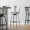 Seat your guests in comfort and style with this Lancaster Table & Seating clear coat cross back swivel bar height chair with blue padded seat. This bar height chair has a sleek and sturdy metal frame along with a comfortable and soft 2 1/2″ thick vinyl padded seat. Its back rest features a trendy cross back design that adds a modern look to any location. Because it is contoured for a customer’s back, it provides unmatched comfort while maintaining a distinct appearance. The swivel design and foot rest allow patrons to turn in their chairs to comfortably socialize and fully enjoy your venue. This bar height chair is designed with integrated plastic glides to protect your floors from scuffing. The clear coat on the frame adds a contemporary touch and ensures longevity even through everyday wear and tear – resisting stains, scratches, and smudges. This reliable design ensures you’ll be using this bar height chair in your bar or restaurant for years to come! Overall Dimensions: Height: 44 1/2″ Seat Width: 16 3/4″ Seat Depth: 16 1/2″ Seat Height: 31 1/2″ Capacity: 300 lb.