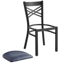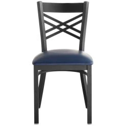 Seat your guests in comfort and style with this Lancaster Table & Seating black cross back chair with navy vinyl seat. The black finish gives you an elegant, upscale look that matches almost any decor, while the sturdy frame provides long-lasting durability. Plus, its eye-catching cross back design is contoured for a customer’s back, which provides unmatched comfort while maintaining a distinct look for your dining area. At an ideal height for standard dining seating, this chair is a versatile option for any restaurant, bar, deli, or coffee shop. The 2 1/2″ thick padded vinyl is filled with CA117 fire-retardant foam for the best in comfort and safety, while integrated glides are designed to protect your floors from scuffing. For additional user convenience, the chair weighs just less than 14 lb. for easy mobility from one destination to the next! This reliable design ensures you’ll be using this chair in your pub or restaurant for years to come. Overall Dimensions: Width: 17″ Depth: 19″ Height: 32 1/2″ Seat Width: 16 3/4″ Seat Depth: 17″ Seat Height: 17 1/4″ Cushion Thickness: 2 1/2″ Capacity: 330 lb.