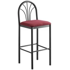 Perfect for your outdoor dining areas, cafes, and bars, or inside at your restaurant, coffee shop, or lounge, this Lancaster Table & Seating fan back bar height cafe chair with 1 3/4″ maroon fabric seat accents the classy feel of any location. The chair features a sturdy, heavy-duty welded steel frame that is powder coated to help prevent stains, scratches, and smudges. At an ideal height for both bar and raised table seating, this chair is a versatile option for any restaurant, bar, deli, or coffee shop. Also included is a maroon fabric seat to provide added comfort and support, as well as extra hardware for added convenience. Nylon glides are designed to protect your floors from scuffing, while the unique 4-spoke back adds a distinct look to your facility. In addition, an integrated foot rest provides further comfort and support for all your guests. For added user convenience, the chair comes pre-assembled and ready to use right out of the box! This saves significant time and labor during setup. Users can simply unpack it, place it in its desired location, and proceed to more important tasks. Kit Includes: – (1) chair frame – (1) hardware set – (1) fabric seat Chair Dimensions: Width: 16 1/2″ Depth 16 1/2″ Height: 44″ Seat Width: 16 1/2″ Seat Depth: 15 3/4″ Seat Height: 28 1/2″ Capacity: 250 lb.