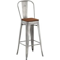 To ensure that your customers are free to enjoy your signature drinks, appetizers, entrees, and desserts, this industrial bar height stool features a supportive back and comfortable wooden seat that has been stained in walnut to enhance its natural wood grain appeal for a high-quality look. Wood lends a certain feel of permanence and quality, showing your customers that you care. The stool features a footrest to reduce pressure on your customers’ legs and lower backs. It is also equipped with protective glides that help keep floor surfaces in pristine condition, making it an excellent choice for your indoor dining area.