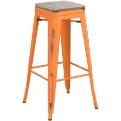 Take your modern restaurant, cafe, or bistro to the next level with this Lancaster Table & Seating Alloy Series distressed orange metal indoor industrial cafe bar height stool with gray wood seat. Made with a durable steel construction, the frame has received an e-coating to seal it against rust. This treatment was followed with a distressed orange powder coating to further enhance durability so you can rest assured that this bar height barstool is sure to withstand years of use. It features a footrest to reduce pressure on your customers’ legs and lower backs. The frame is reinforced with an additional under-seat cross bracing to provide strength and stability without adding extra bulk or weight to this sleek design. It’s lightweight enough for easy movement and transportation so you can quickly reconfigure your dining space and easily clean up at the end of the night. And it can even be stacked to maximize storage space if needed! To ensure that your customers are free to enjoy your signature drinks, appetizers, entrees, and desserts, this industrial bar height stool features a comfortable wooden seat that has been stained with a gray finish that enhances the appearance of the natural wood grain. To keep this stool looking clean, simply wipe it with a damp cloth and your preferred all-purpose cleaner. It is also equipped with protective glides that help keep floor surfaces in pristine condition, making it an excellent choice for your indoor dining area. This item comes with the seat detached to save on shipping costs. All hardware for assembly is included. Overall Dimensions: Width: 16 1/8″ Depth: 16 1/8″ Height: 30 3/4″ Seat Width: 12 1/8″ Seat Depth: 12 1/8″ Weight Capacity: 400 lb.