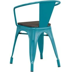 Take your restaurant, cafe, or bistro to the next level with this Lancaster Table & Seating Alloy Series teal metal indoor industrial cafe arm chair with black wood seat. Made with a steel construction, it has received an e-coating to seal it against rust. This treatment was followed with a teal powder coating to further enhance durability so you can rest assured that this cafe chair is sure to withstand years of use. The frame is reinforced with additional under-seat cross bracing to provide strength and stability without adding extra bulk or weight to this sleek design. It’s lightweight enough for easy movement and transportation so you can quickly reconfigure your dining space and easily clean up at the end of the night. It can even be stacked to maximize storage space if needed! To ensure that your customers are free to enjoy your signature drinks, appetizers, entrees, and desserts, this industrial chair features a comfortable wooden seat that has been painted black for a clean, even look, as well as a supportive back and a comfortable seat with a rounded lip to reduce pressure on your customers’ legs and lower backs. Solid arms add extra comfort, allowing your guests to relax and enjoy their meal. To keep this chair looking clean, simply wipe with a damp cloth and your preferred mild all purpose cleaner. This chair is an excellent choice for your indoor dining area. Overall Dimensions: Width: 17 5/16″ Depth: 17″ Height: 28 1/2″ Seat Width: 14 1/8″ Seat Depth: 14 1/2″ Seat Height: 17 3/4″ Capacity: 400 lb.