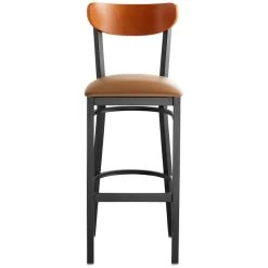 This Lancaster Table & Seating Boomerang bar height black chair has a contemporary steel frame along with a comfortable light brown vinyl seat and trendy cherry back. This reliable and modern design ensures you’ll be using this bar height chair in your pub or restaurant for years to come