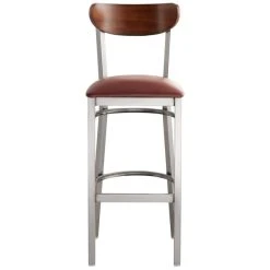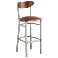 This Lancaster Table & Seating Boomerang bar height clear coat chair has a contemporary steel frame along with a comfortable burgundy vinyl seat and trendy antique walnut back. This reliable and modern design ensures you’ll be using this bar height chair in your pub or restaurant for years to come.