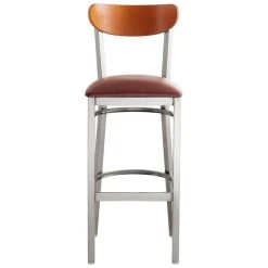 This Lancaster Table & Seating Boomerang bar height clear coat chair has a contemporary steel frame along with a comfortable burgundy vinyl seat and trendy cherry finish back. This reliable and modern design ensures you’ll be using this bar height chair in your pub or restaurant for years to come.