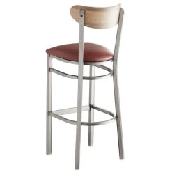 This Lancaster Table & Seating Boomerang bar height clear coat chair has a contemporary steel frame along with a comfortable burgundy vinyl seat and trendy driftwood back. This reliable and modern design ensures you’ll be using this bar height chair in your pub or restaurant for years to come.