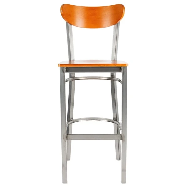 Seat your guests in comfort and style with this Lancaster Table & Seating Boomerang bar height chair with a cherry seat and back. The Boomerang chair is both sturdy and stylish, instilling a modern look in any location. Its reliable and modern design ensures you’ll be using this bar height chair in your pub or restaurant for years to come.