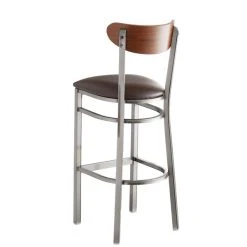 This Lancaster Table & Seating Boomerang bar height clear coat chair has a contemporary steel frame along with a comfortable dark brown vinyl seat and trendy antique walnut back. This reliable and modern design ensures you’ll be using this bar height chair in your pub or restaurant for years to come.