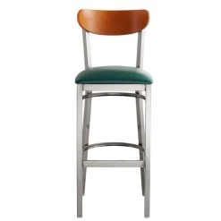 This Lancaster Table & Seating Boomerang bar height clear coat chair has a contemporary steel frame along with a comfortable green vinyl seat and trendy cherry back. This reliable and modern design ensures you’ll be using this bar height chair in your pub or restaurant for years to come.