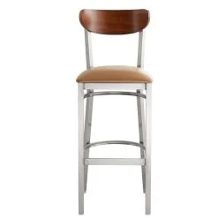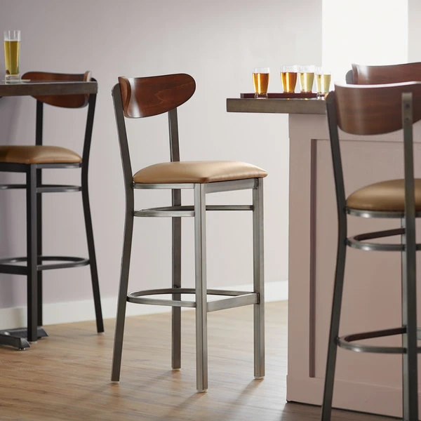 This Lancaster Table & Seating Boomerang bar height clear coat chair has a contemporary steel frame along with a comfortable light brown vinyl seat and trendy antique walnut back. This reliable and modern design ensures you’ll be using this bar height chair in your pub or restaurant for years to come.