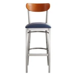 This Lancaster Table & Seating Boomerang bar height clear coat chair has a contemporary steel frame along with a comfortable navy vinyl seat and trendy cherry back. This reliable and modern design ensures you’ll be using this bar height chair in your pub or restaurant for years to come.