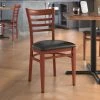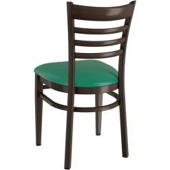 Tired of choosing between comfort and strength when picking chairs for your restaurant, coffee shop, or bistro? With the Lancaster Table & Seating Spartan series metal ladder back chair, you can provide your guests with both. This product has a durable design that is sure to stand up to long-term use in your foodservice establishment. Thanks to the neutral walnut woodgrain finish and green vinyl seat, you also don’t have to worry about this chair clashing with your color scheme and decor.